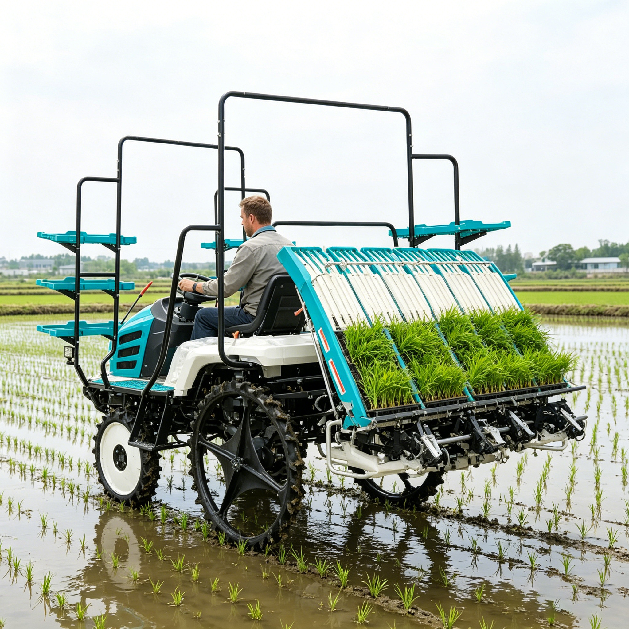The Riding Rice Transplanter is a high-speed agricultural machine designed with a riding-type structure, powered by a reliable diesel engine and equipped with HST hydraulic continuously variable transmission for smooth and efficient operation. Its six-row transplanting configuration, paired with a precise seedling picking and delivery system, ensures consistent planting quality. The machine features an automatic depth control system and intelligent walking control, complemented by mechanical row spacing adjustment with multiple gear options to accommodate different agronomic needs. It is fitted with explosion-proof tires and rough-wheel rubber tires for enhanced passability, along with a shock-absorbing seat and ergonomic control panel for operator comfort.